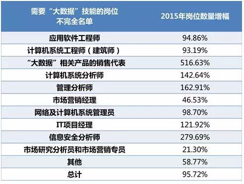 就岗位数量而言,需要“大数据”技能的岗位空缺呈现高速增长,如下图所示,其中“大数据”解决方案的销售人员、计算机系统分析师、管理分析师、IT项目经理、和信息安全分析师岗位的增幅都在100%以上。这一增长趋势也将延续至2016年。