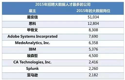就招聘企业而言,易安信、IBM、思科、甲骨文在2015年招聘的“大数据”人才最多。其他前十的企业信息如下: