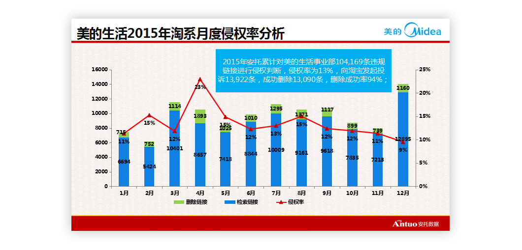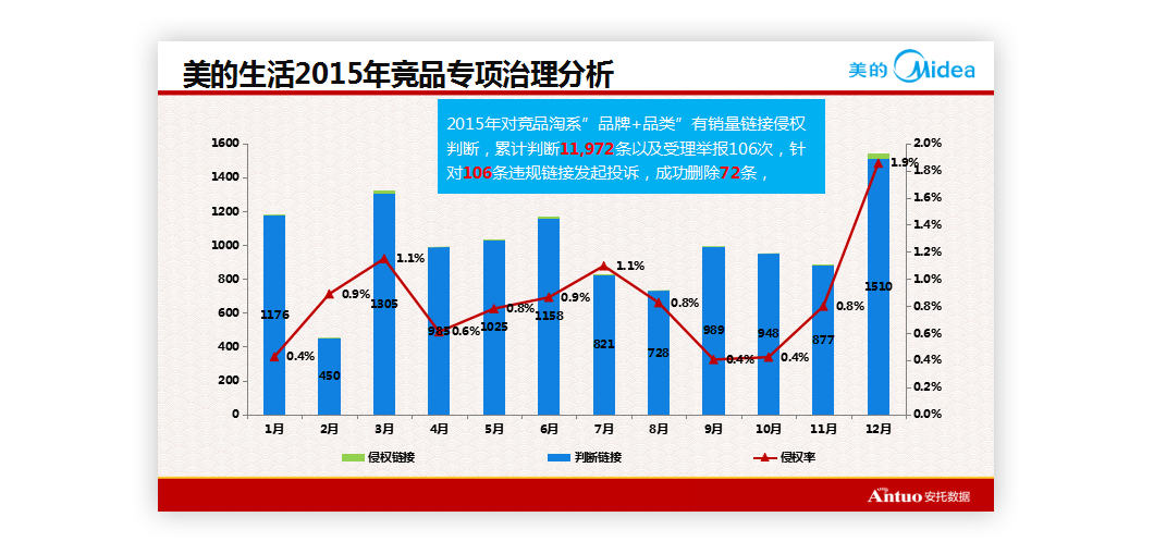 安托通过针对性的治理和常规的日常管理两种方式,使美的第一时间发现低价的网站和店铺,使低价URL数量大幅减少,改善美的生活电商渠道秩序至良性运营。